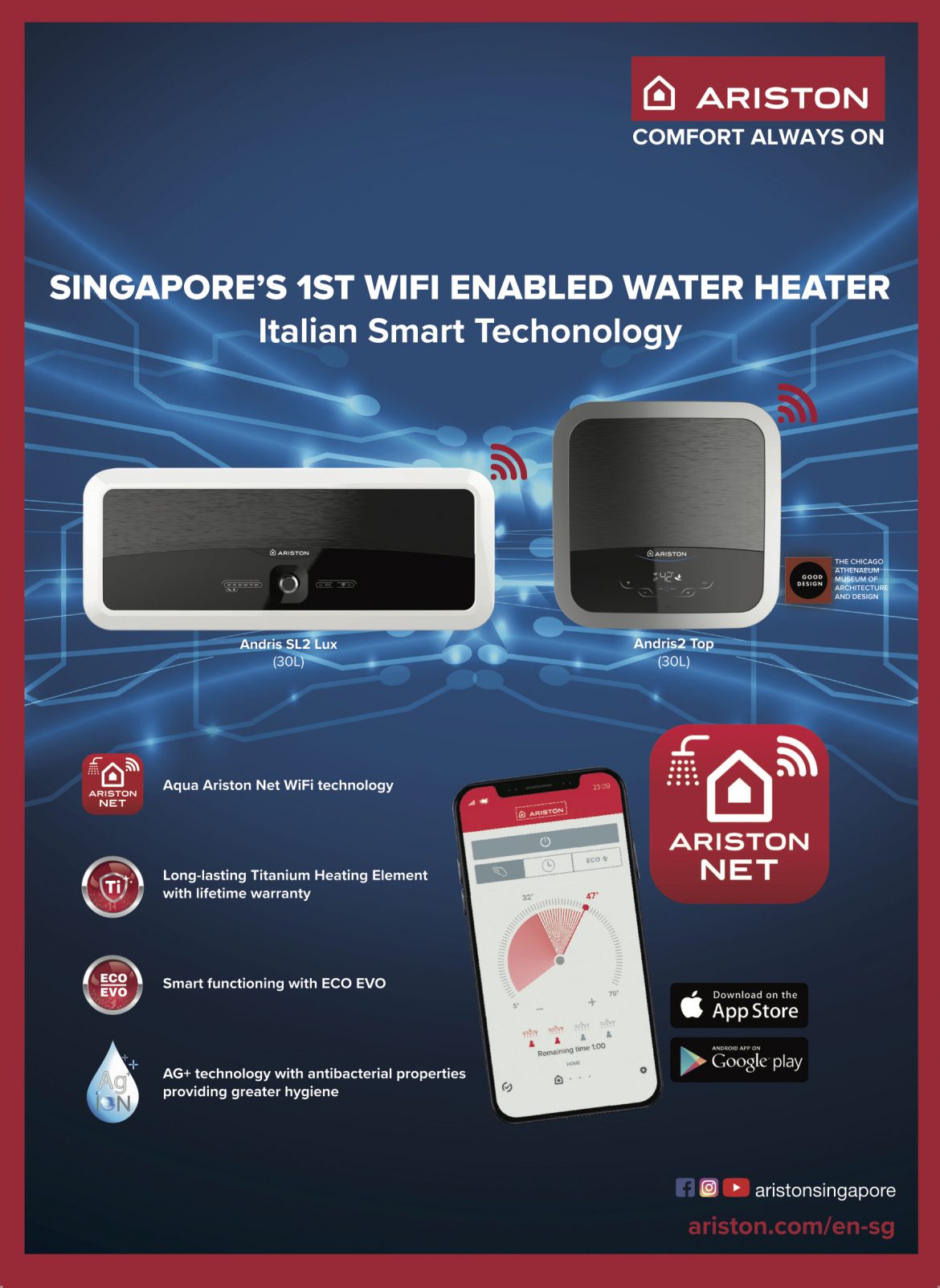 With over 90 years of experience in the water heating industry, Ariston believes in innovation at the service of domestic technology. Newly launched in July 2020, Ariston Slim2 Lux 30 WiFi electric storage water heater combines WiFi Smart controls with elegance and smart use of space. Designed to perfectly fit into bathrooms in new condominiums and HDB flats, the Slim2 Lux’s exclusive Italian design will instantly glam up any bathroom. On top of that, the water heater is equipped with patented long-lasting titanium heating element with lifetime warranty, energy-saving with smart ECO-EVO technology and AG+ silver ions with antibacterial properties for greater hygiene!